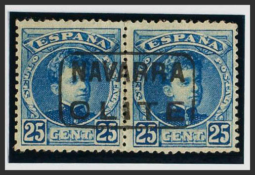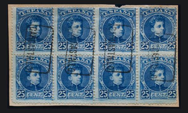 248(8). 1901. 25 cts azul, bloque de ocho, matasello carterÃa CARCASTILLO (sin texto en la parte superior, omitida la provincia Navarra). MAGNIFICO Y RARO.