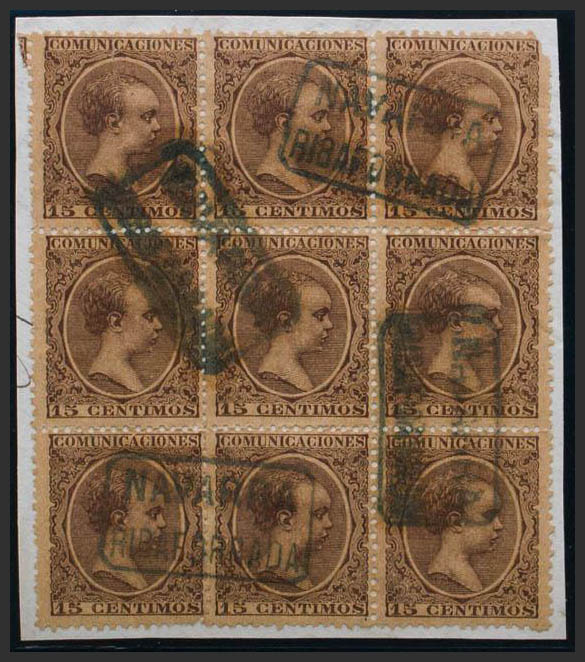 219(9). 1889. 15 cts castaño, bloque de nueve. Matasello carterÃa NAVARRA / RIBAFORRADA, en azul. MAGNIFICO Y RARO.