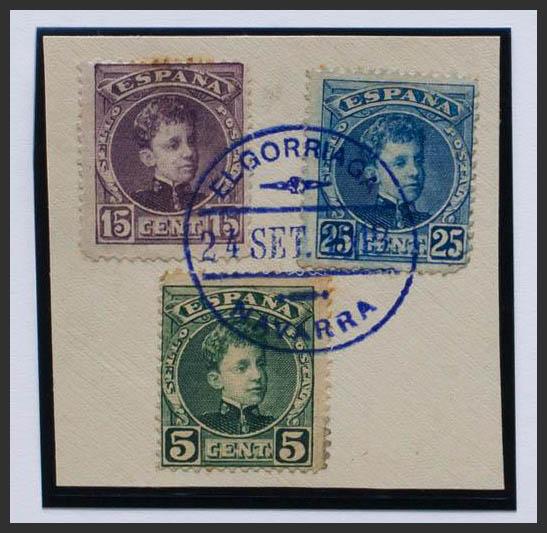 △ 242, 245, 248. 1901. 5 cts verde, 15 cts lila castaño y 25 cts azul, sobre fragmento. Matasello especial "fechador pequeño" ELGORRIAGA / NAVARRA, en violeta. MAGNIFICO Y RARO.