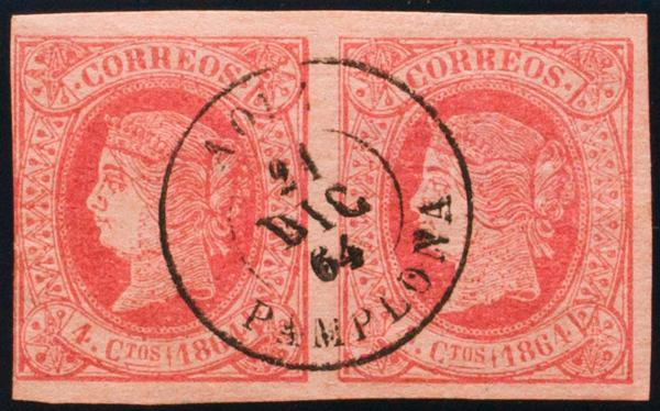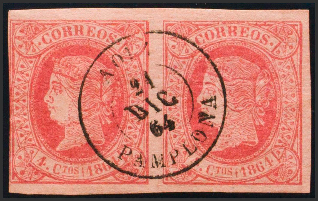 △ 58(2). 1862. 4 cuartos castaño, pareja sobre fragmento. Matasello prefilatélico PAMPLONA. MAGNIFICO Y MUY RARO EN ESTA EXCEPCIONAL CALIDAD.
