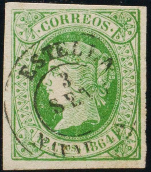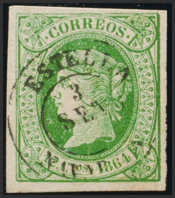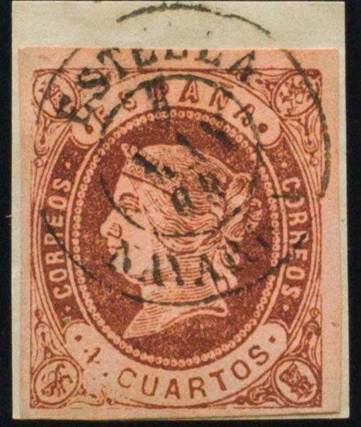 △ 58. 1862. 4 cuartos castaño, sobre fragmento. Matasello ESTELLA / NAVARRA. MAGNIFICO.