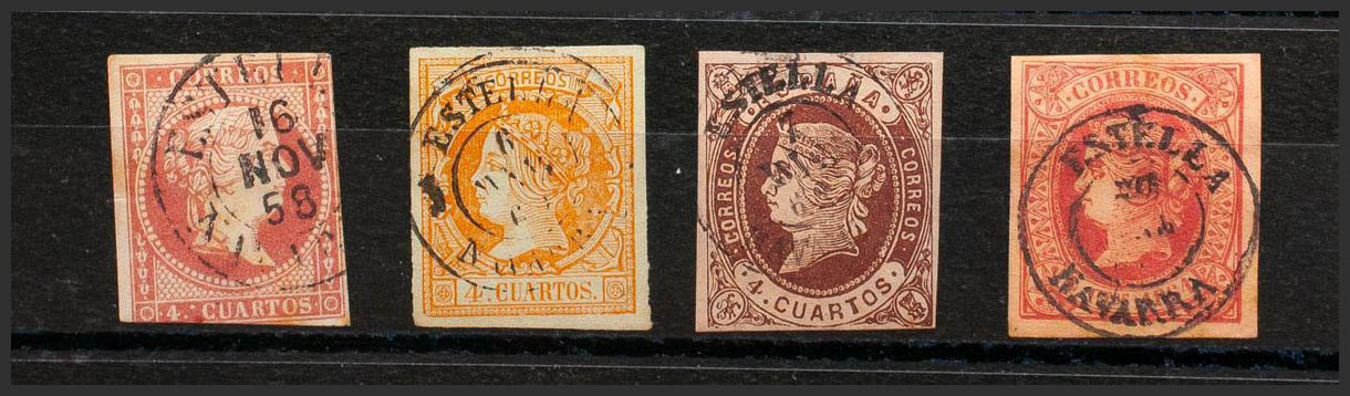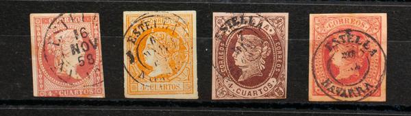 48, 52, 58, 64. (1855ca). Conjunto de cuatro sellos del 4 cuartos rojo, amarillo, castaño y rosa, inutilizados con matasello ESTELLA / NAVARRA (Tipo I en el 4 cuartos rojo). MAGNIFICO.