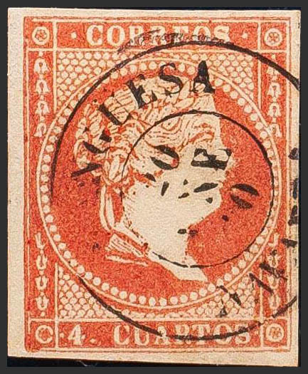 48. 1855. 4 cuartos rojo. Matasello SANTESTEBAN / NAVARRA (Tipo I). MAGNIFICO Y RARO.
