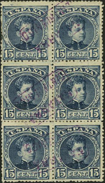 245(6). 1889. 15 cts castaño lila, bloque de seis. Matasello carterÃa NAVARRA / VILLAFRANCA. MAGNIFICO.