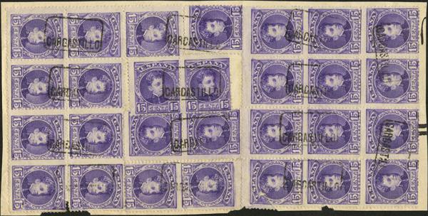 △ 246(28). 1901. 15 cts violeta, veintiocho sellos sobre fragmento. Matasello carterÃa NAVARRA / CARCASTILLO. MAGNIFICO Y RARO BLOQUE.