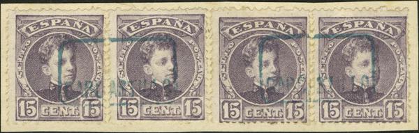 △ 245(4). 1901. 15 cts lila, cuatro sellos sobre fragmento. Matasello carterÃa NAVARRA / CARCASTILLO. MAGNIFICO.