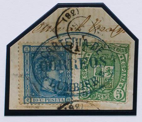 △ 164, 154. 1875. 10 cts azul y 5 cts verde, sobre fragmento. Matasello especial oval CARTERIA DE / LUMBIER, en azul. MAGNIFICA Y RARISIMA.