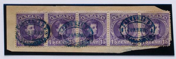 △ 246(5). 1901. 15 cts violeta, tira de cinco sobre fragmento. Matasello CARTERIA DE / VILLAFRANCA, en azul. MAGNIFICA Y RARA.
