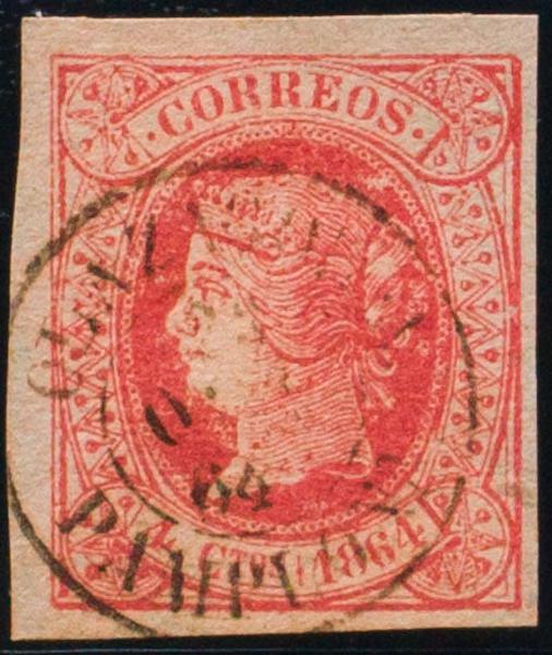 64. 1864. 4 cuartos rojo. Matasello OLAZAGOITIA / PAMPLONA. MAGNIFICO Y RARISIMO.