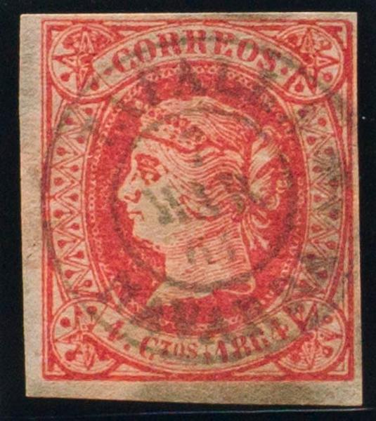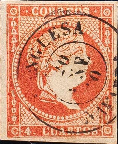 48. 1855. 4 cuartos rojo. Matasello VIANA / NAVARRA (Tipo I). MAGNIFICO Y RARO.