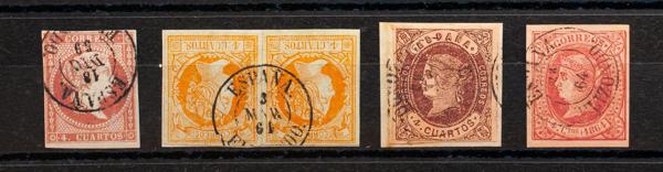 58(11). 1862. Preciosa colección de diez sellos y una pareja del 4 cuartos castaño de 1862, algunos sobre fragmento e inutilizados con diferentes fechadores del Tipo I y II de la provincia de Navarra. MAGNIFICO CONJUNTO.