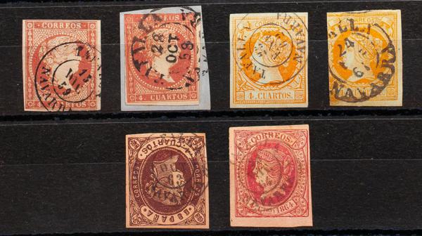 48(2), 52(2), 58, 64. (1855ca). Conjunto de seis sellos del 4 cuartos rojo, amarillo, castaño y rosa, inutilizados con el matasello TAFALLA / NAVARRA (incluyendo el Tipo I sobre el 4 cuartos rojo y 4 cuartos amarillo). MAGNIFICO.