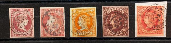 48, 52(2), 58, 64. (1855ca). Conjunto de cinco sellos del 4 cuartos rojo, amarillo (en pareja), castaño y rosa, inutilizados con matasello ESPAÑA / ELIZONDO. MAGNIFICO.