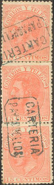 210(3). 1882. 15 cts naranja, tira vertical de tres. Matasello CARTERIA / PARACUELLOS, de Zaragoza. MAGNIFICO.