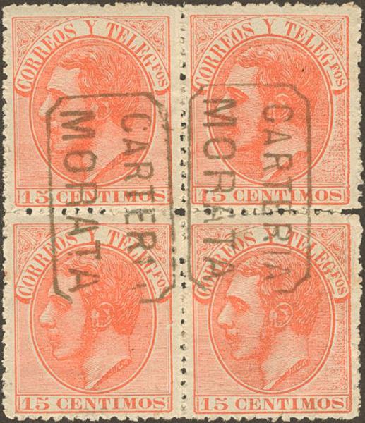 210(4). 1882. 15 cts naranja, bloque de cuatro. Matasello CARTERIA / MORATA, de Zaragoza. MAGNIFICO.