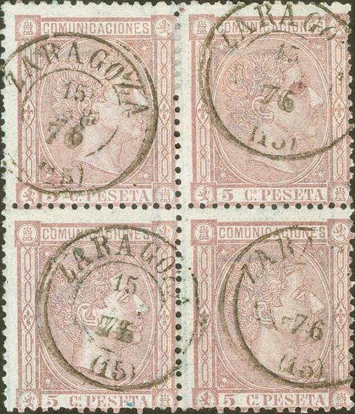 163(4). 1875. 5 cts lila, bloque de cuatro. Matasello ZARAGOZA / (15). MAGNIFICO Y MUY RARO, PIEZA DE ENORME ESPECTACULARIDAD.