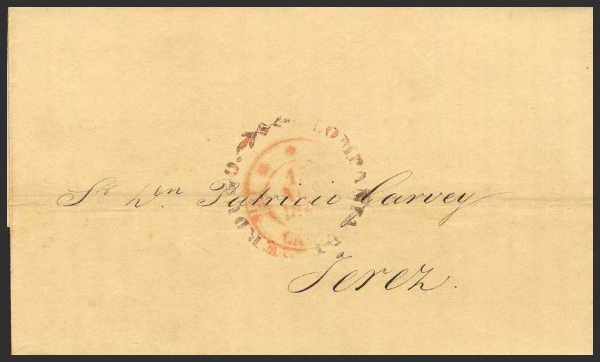 1846. CADIZ a JEREZ. Marca COMPAÑIA DE BERDUGO (P.E.7) edición 2004, enmarcando el baeza de Cádiz. MAGNIFICA Y RARA CON INUSUAL ESTAMPACION.