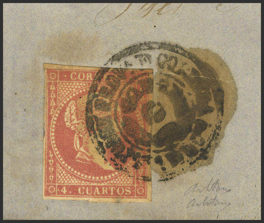 △ 48. 1855. 4 cuartos rojo, sobre fragmento. Matasello ISLA DE LEON / CADIZ. MAGNIFICO.