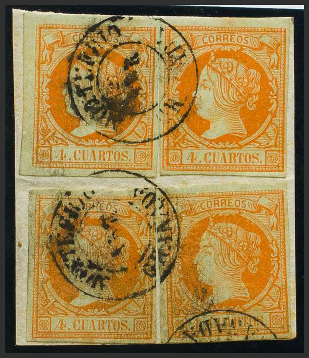 52(8). 1860. 4 cuartos naranja, bloque de ocho. Matasello R.CARRETA Nº53, de Ecija. MAGNIFICO Y RARISIMO.