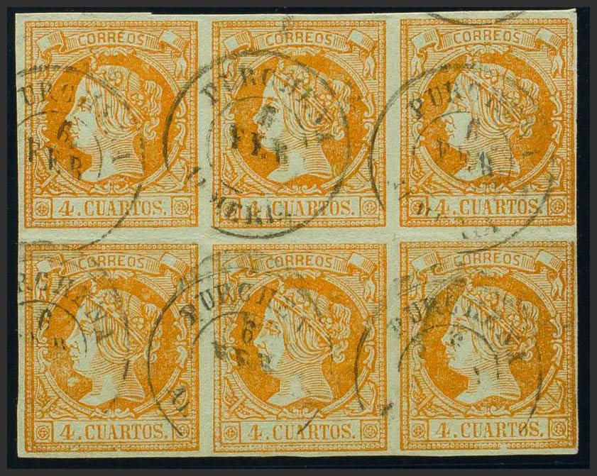 52(6). 1860. 4 cuartos naranja, bloque de seis. Matasello PURCHENA / ALMERIA. MAGNIFICO Y RARO.