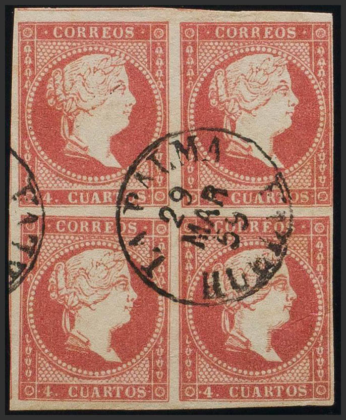 48(4). 1856. 4 cuartos rojo, bloque de cuatro. Matasello LA PALMA / HUELVA (Tipo I). MAGNIFICO Y EXTRAORDINARIAMENTE RARO.