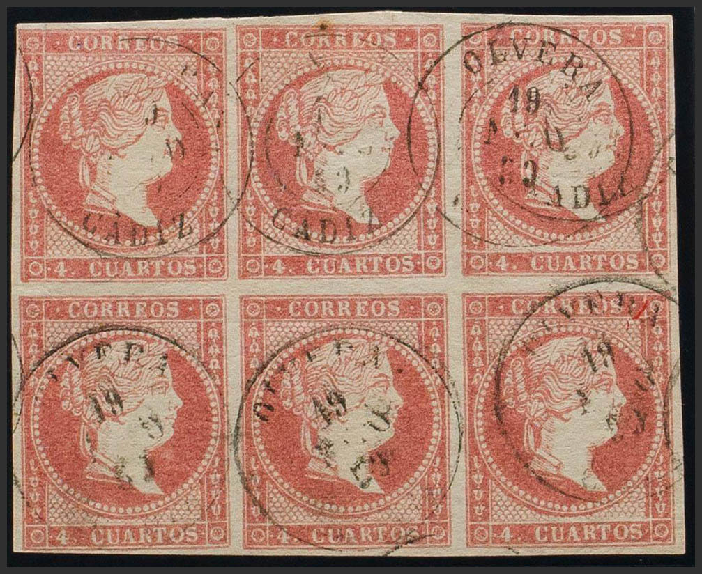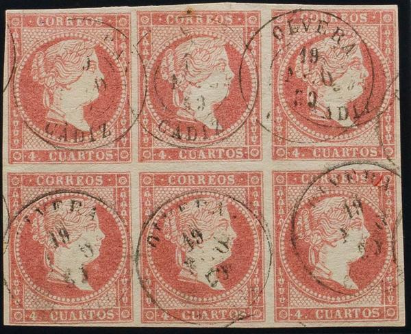 52(6). 1860. 4 cuartos naranja, bloque de seis. Matasello ALGECIRAS / CADIZ (Tipo I). MAGNIFICO.