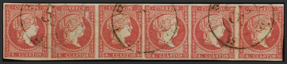 △ 48(4). 1856. 4 cuartos rojo, tira de cuatro, sobre fragmento. Matasello LUISIANA / SEVILLA. MAGNIFICA Y RARISIMA.