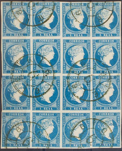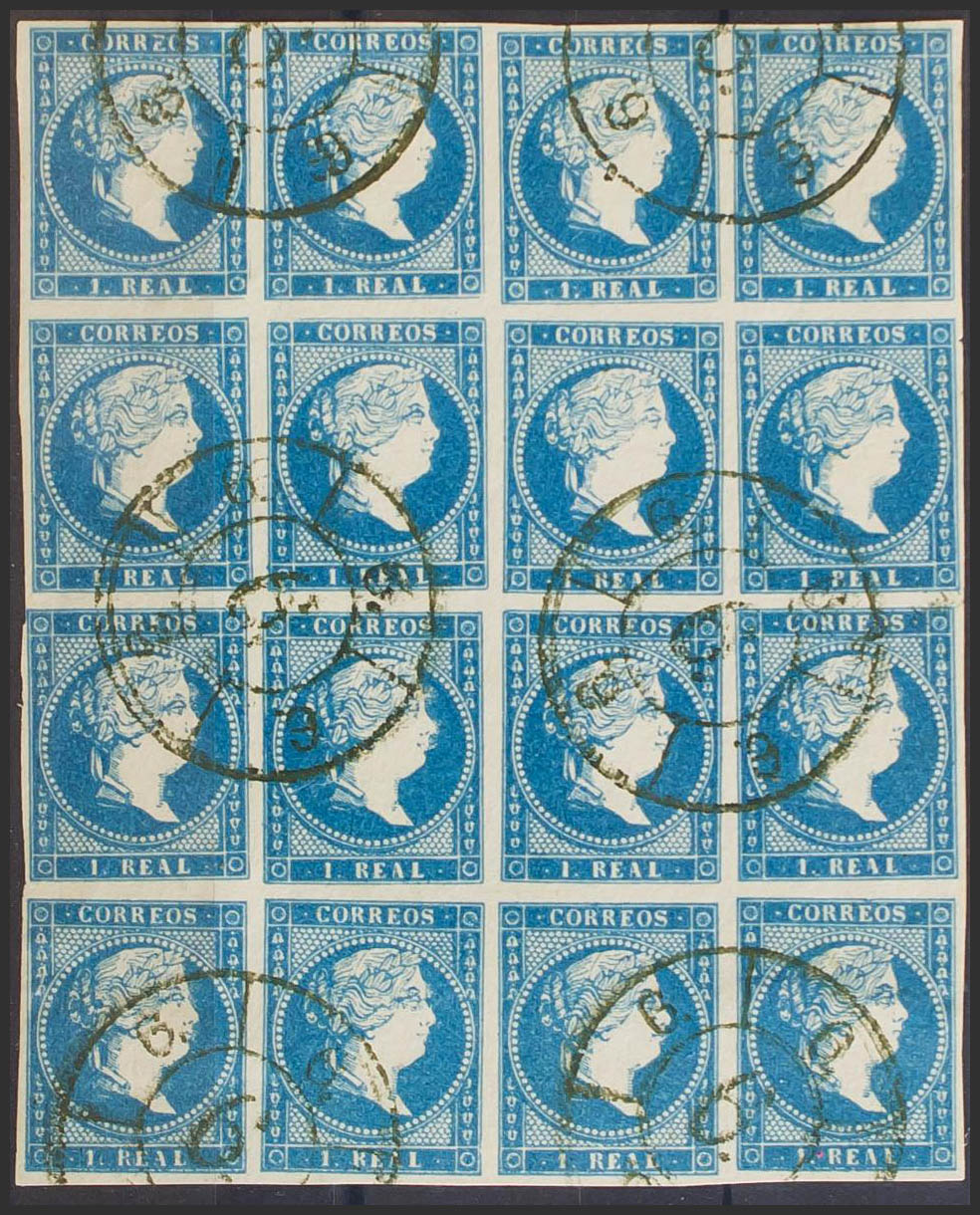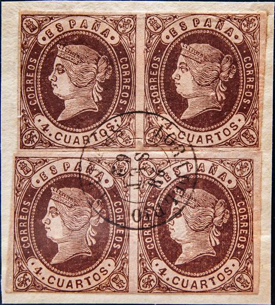 52(68). 1860. 4 cuartos naranja, bloque de sesenta y ocho. Matasello R.CARRETA Nº63, de San Roque. MAGNIFICO Y PIEZA DE ENORME ESPECTACULARIDAD.