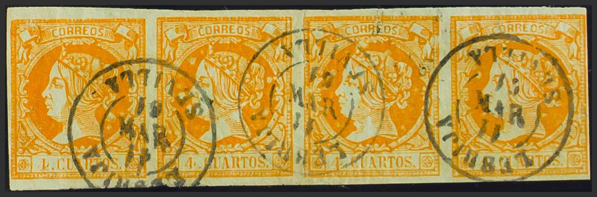 52(4). 1860. 4 cuartos naranja, tira de cuatro. Matasello LEBRIJA / SEVILLA. MAGNIFICA.
