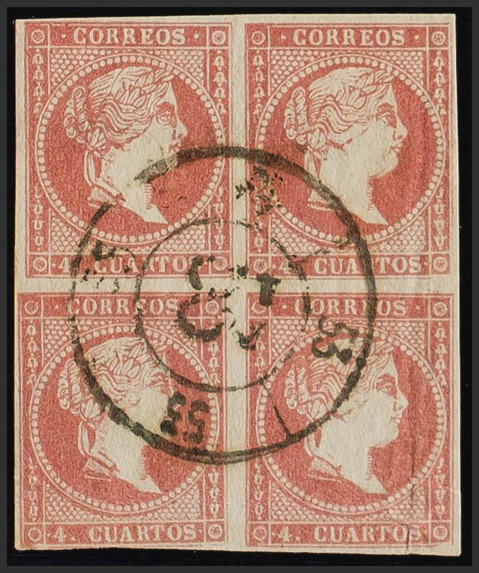 48(4). 1856. 4 cuartos rojo, bloque de cuatro. Matasello R.CARRETA Nº5, de Granada. MAGNIFICO.