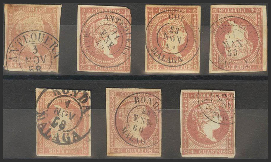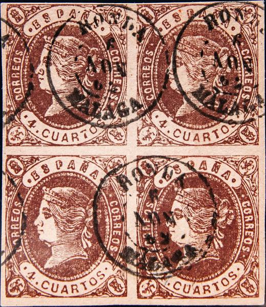 58(4). 1862. 4 cuartos castaño, bloque de cuatro. Matasello RONDA / MALAGA. MAGNIFICO.