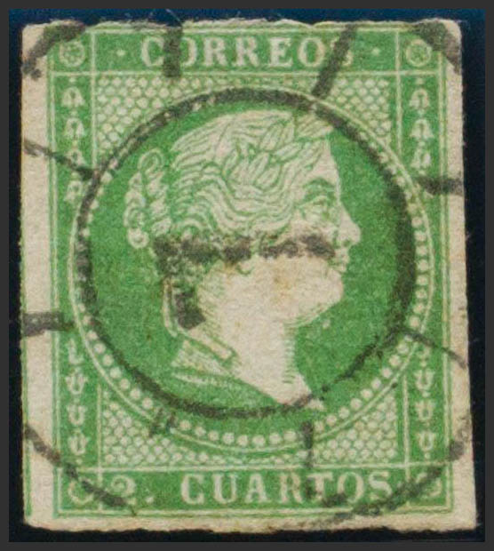 47. 1855. 2 cuartos verde. Matasello R.CARRETA Nº7, de Sevilla. MAGNIFICO.