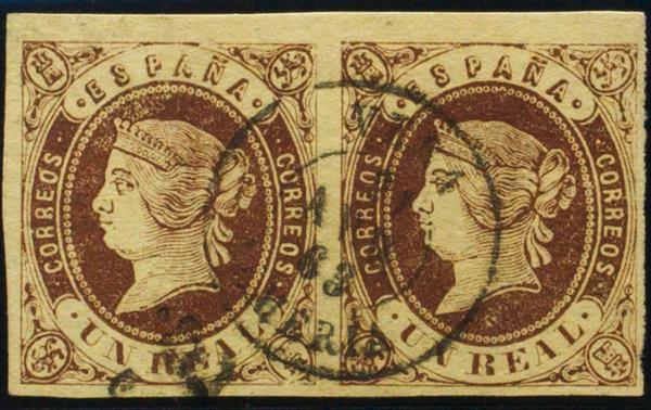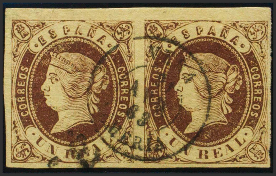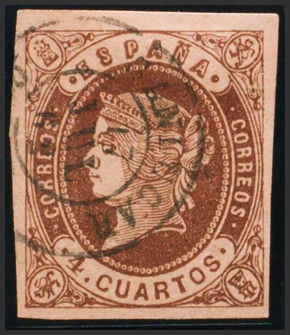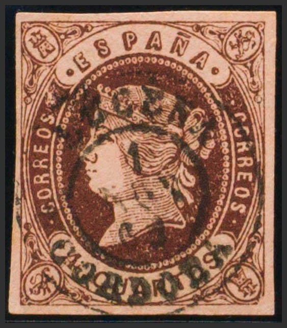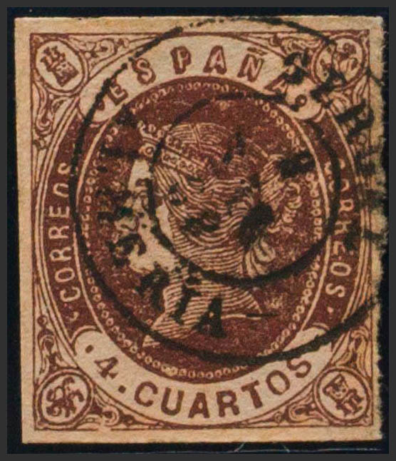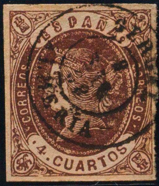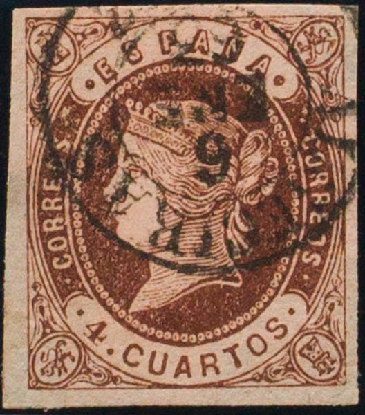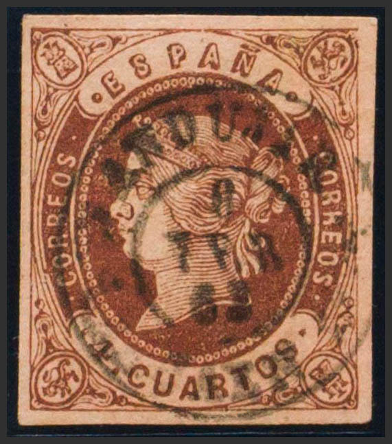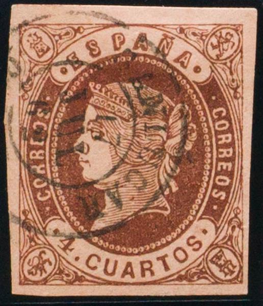 58. 1862. 4 cuartos castaño. Matasello SANLUCAR / CADIZ. MAGNIFICO.