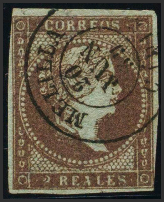 42. 1855. 2 reales violeta. Matasello MELILLA / CADIZ. MAGNIFICO Y MUY RARO.