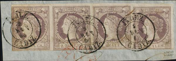 △ 56(4). 1860. 2 reales lila, tira de cuatro, sobre fragmento. Matasello JEREZ / CADIZ. MAGNIFICA. Edifil 2014: +++95 Euros