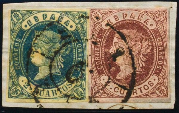 57, 58. 1862. 2 cuartos azul y 4 cuartos castaño, sobre fragmento. Matasello SEVILLA / (7). MAGNIFICO Y RARO.