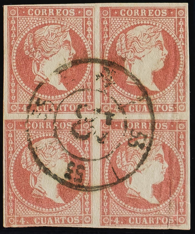 48(4). 1855. 4 cuartos rojo, bloque de cuatro. Matasello R.CARRETA Nº53, de Ecija. MAGNIFICO.