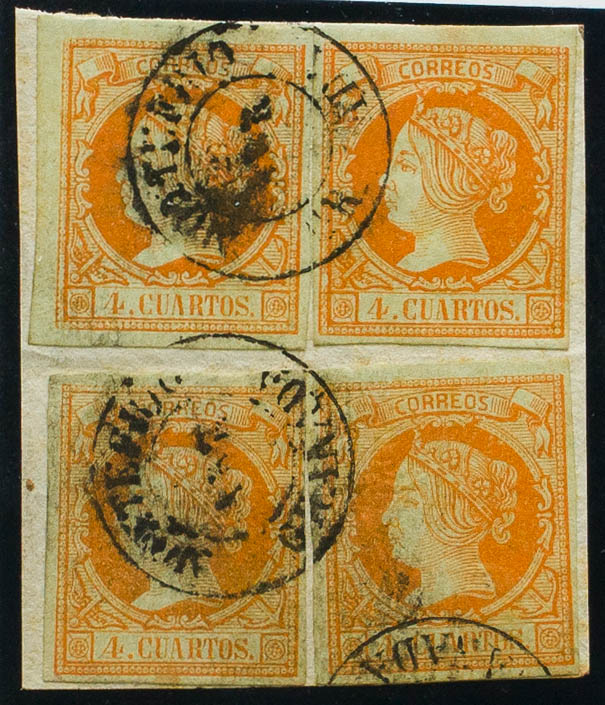 52(4). 1860. 4 cuartos naranja, cuatro sellos, sobre fragmento. Matasello MONTEFRIO / GRANADA. MAGNIFICO.