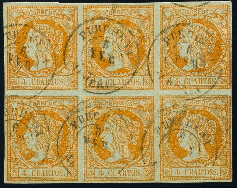 52(6). 1860. 4 cuartos naranja, bloque de seis. Matasello PURCHENA / ALMERIA. MAGNIFICO Y RARO.
