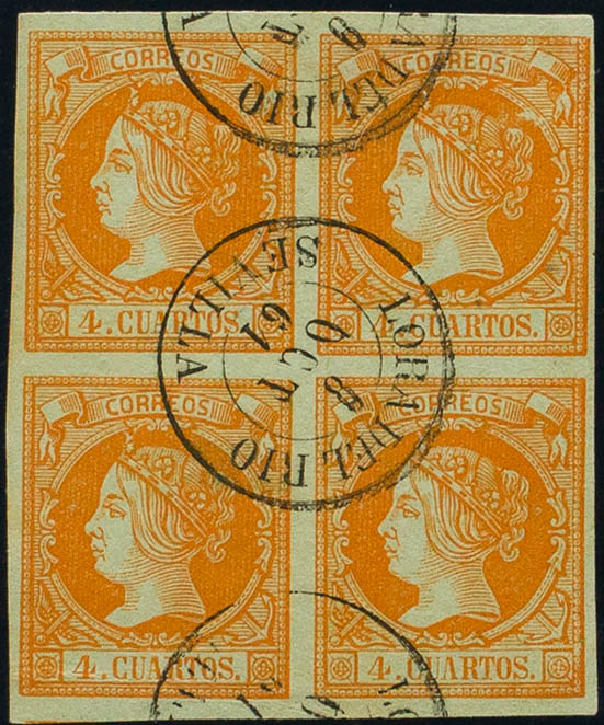 52(4). 1860. 4 cuartos naranja, bloque de cuatro. Matasello LORA DEL RIO / SEVILLA. MAGNIFICO.