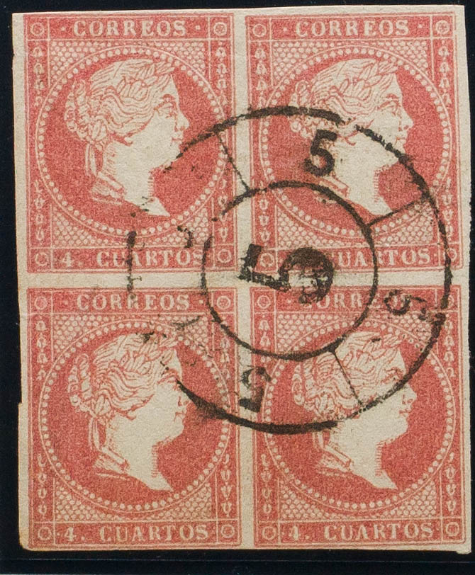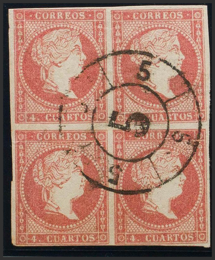 48(4). 1856. 4 cuartos rojo, bloque de cuatro. Matasello R.CARRETA Nº5, de Granada. MAGNIFICO.