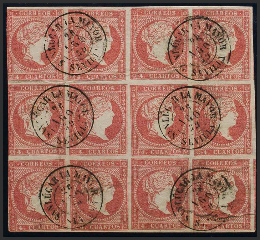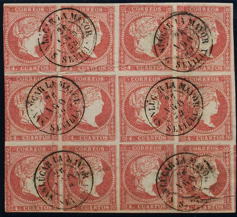 48(12). 1856. 4 cuartos rojo, bloque de doce. Matasello SANLUCAR LA MAYOR / SEVILLA. MAGNIFICO Y MUY RARO.