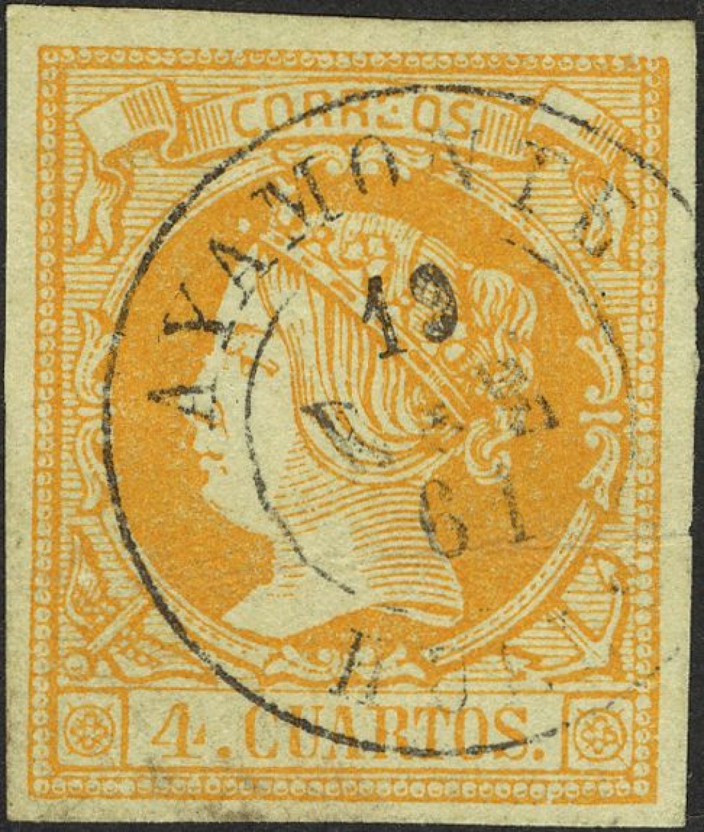 52. 1860. 4 cuartos amarillo. Matasello AYAMONTE / HUELVA.