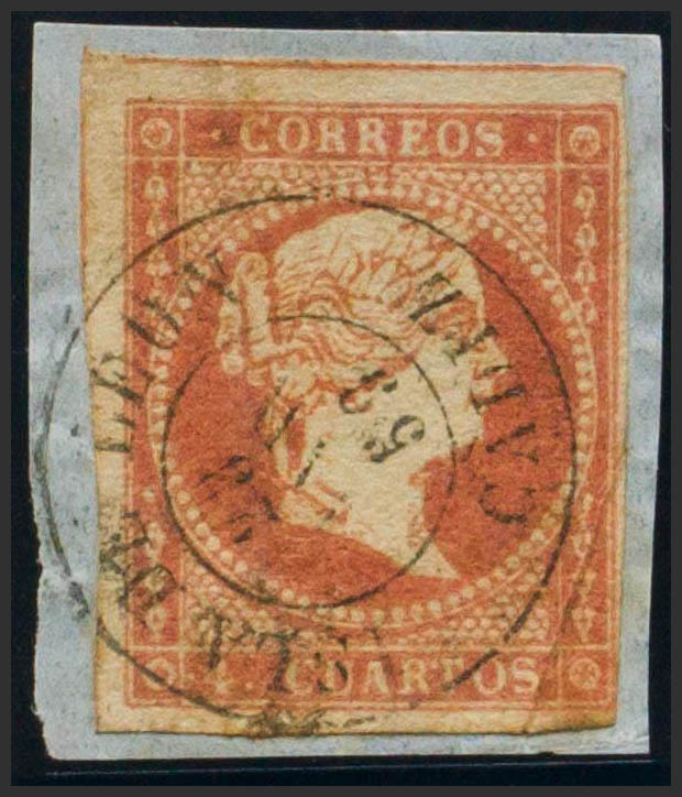△ 48. 1855. 4 cuartos rojo, sobre fragmento. Matasello ISLA DE LEON / CADIZ. MAGNIFICO.