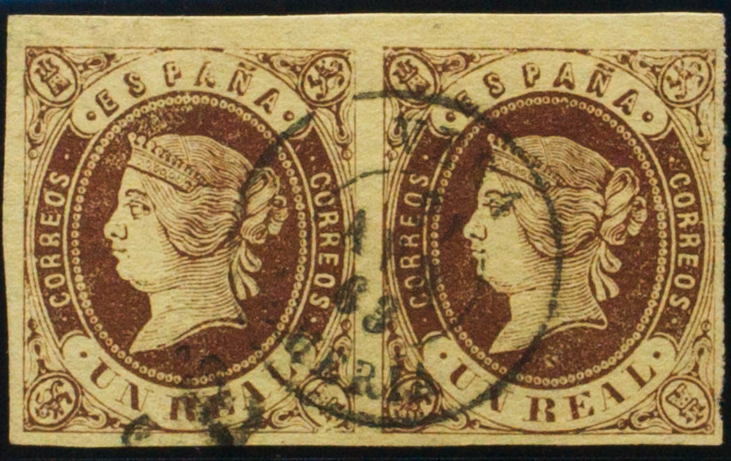 61(2). 1862. 1 real castaño, pareja. Matasello VERA / ALMERIA. MAGNIFICA Y RARA.