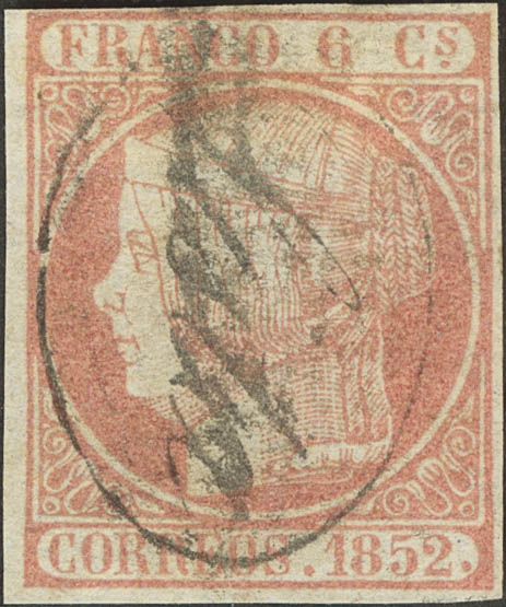 12. 1852. 6 cuartos rosa. Matasello prefilatélico LISTA, en negro de Cádiz. MAGNIFICO Y RARISIMO. Cert. COMEX. Ex-Alemany.