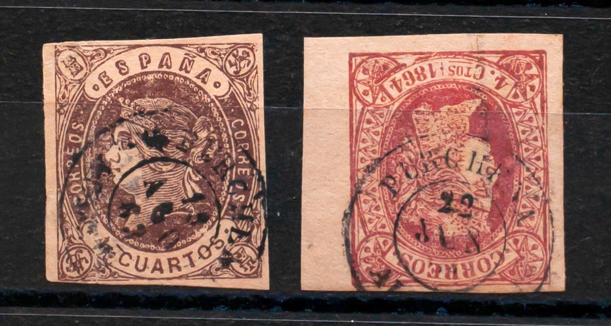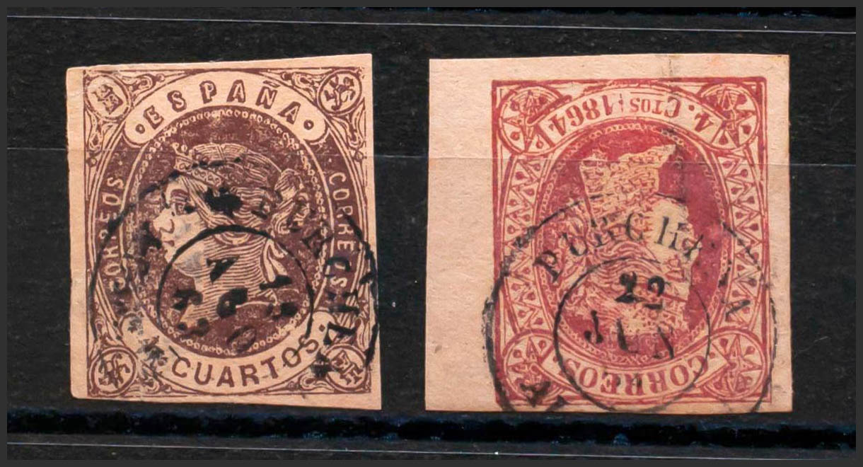 58, 64. (1862ca). Conjunto de dos sellos del 4 cuartos castaño y 4 cuartos rosa, inutilizados con matasello PURCHENA / ALMERIA. MAGNIFICO Y RARO.