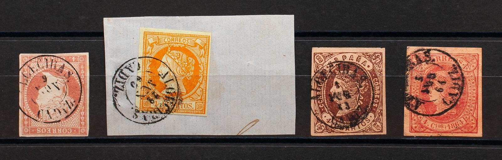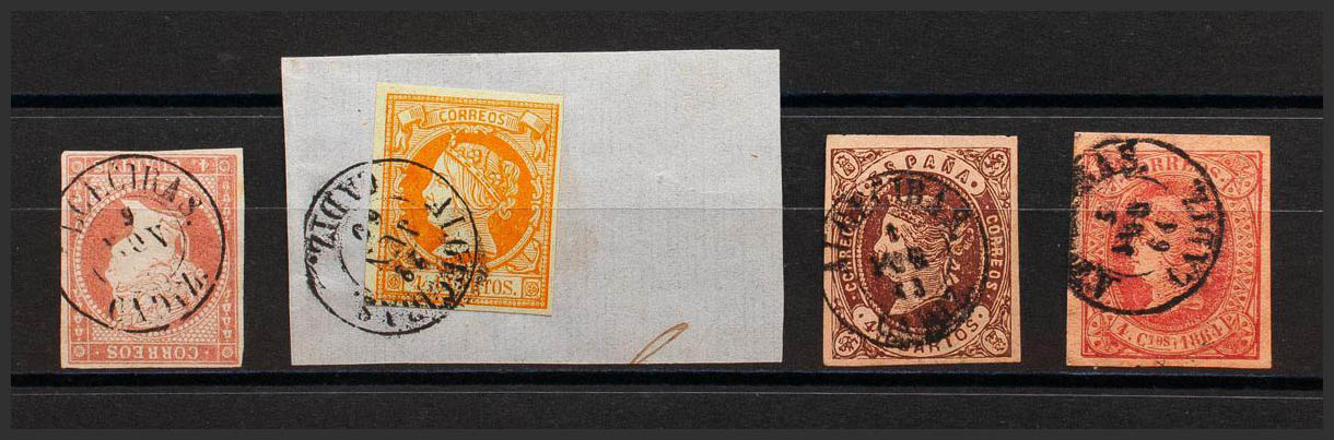48, 52, 58, 64. (1855ca). Conjunto de cuatro sellos del 4 cuartos rojo, amarillo, castaño y rosa, inutilizados con el matasello ALGECIRAS / CADIZ. MAGNIFICO.