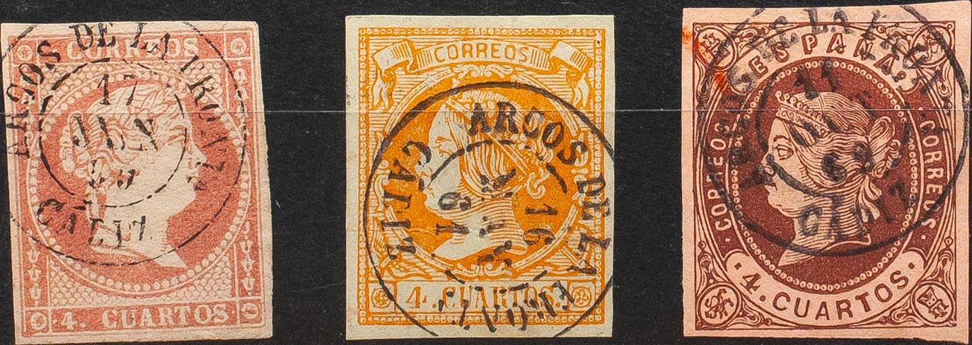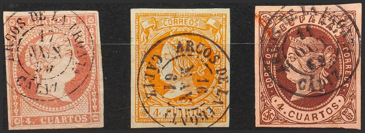 48, 52, 58. (1855ca). Conjunto de tres sellos del 4 cuartos rojo, amarillo y castaño, inutilizados con matasello ARCOS DE LA FRONTERA / CADIZ. MAGNIFICO.