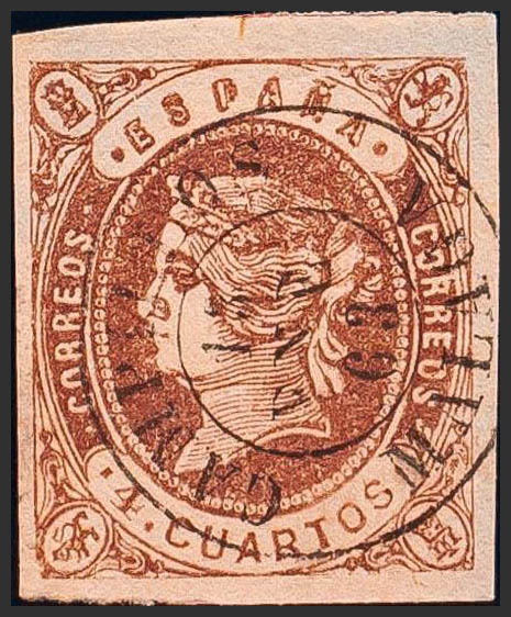 58. 1862. 4 cuartos castaño. Matasello CAMPILLOS / MALAGA. MAGNIFICO.